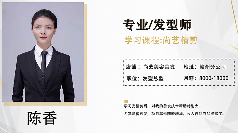 陈香 专业/发型师 学习课程:尚艺精剪 店铺:尚艺美容美发,职位:发型总监地址:赣州分公司,月薪:8000-18000 学习完精剪后,对我的剪发技术帮助特别大,尤其是剪短发,项目率也随着增加,收入自然而然提高了。